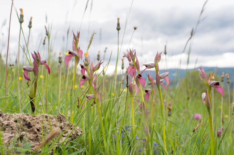We parkeren de auto aan de rand van een bergweide met veel Gaspeldoorn. Na een korte wandeling vinden we de eerste orchideeën. Soldaatje, Poppenorchis en…Wit bosvogeltje (Cephalanthera longifolia), een soort die op meer plekken voorkomt. Nadat we bijna willen besluiten om terug te keren naar de auto, bezoeken we nog een laatste bergweide. Een goede keus blijkt achteraf: het grasland staat vol met Sniporchis en Kleine tongorchis.